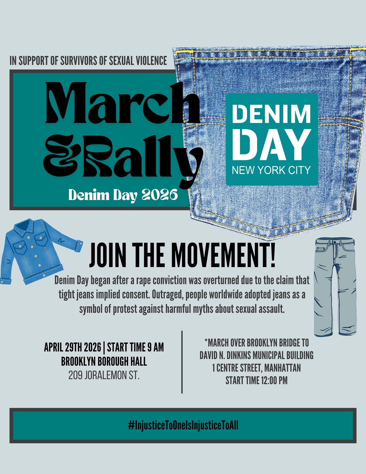 Denim Day is on Wednesday April 29, when people across the world wear denim to denounce harmful behaviors and attitudes that surround sexual violence, celebrate body autonomy, and show support for survivors. This year’s theme is #InjusticeToOneIsInjusticeToAll to signify our solidarity when some in our community feel isolated and afraid. The event includes the Annual March and Rally from Brooklyn Borough Hall to 1 Centre Street-David Dinkins Building. The rally begins at 9 am; the March across the Brooklyn Bridge is scheduled for 11:30 am. To learn more, please click here.