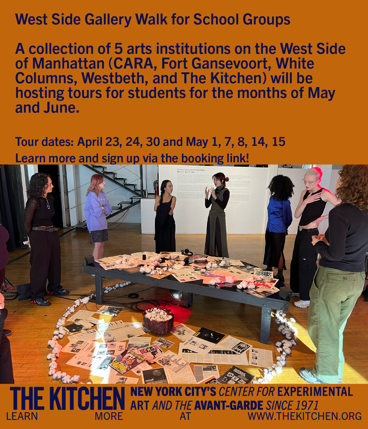 A collection of 5 arts institutions on the west side of Manhattan will be hosting tours of their exhibitions for students during the months of April and May. Each institution will be staffed with an educator or curator ready to speak with the students. The galleries include: Center for Art, Research and Alliances (CARA), 225 W 13th Street, New York, NY 10011 (The Earth, the Fire, the Water, and the Winds: For a Museum of Errantry with Édouard Glissant); Fort Gansevoort, 5 9th Avenue, New York, NY 10014] (Oototol); White Columns, 91 Horatio Street, New York, NY 10014 (Concrete Spirit and Art (by) Dealers); Westbeth Gallery, 55 Bethune St, New York, NY 10014 (WORKING CONDITIONS); and The Kitchen, 163B Bank St., 4th Fl Loft, New York, NY 10014 (Tromorama, Upon a Machine).